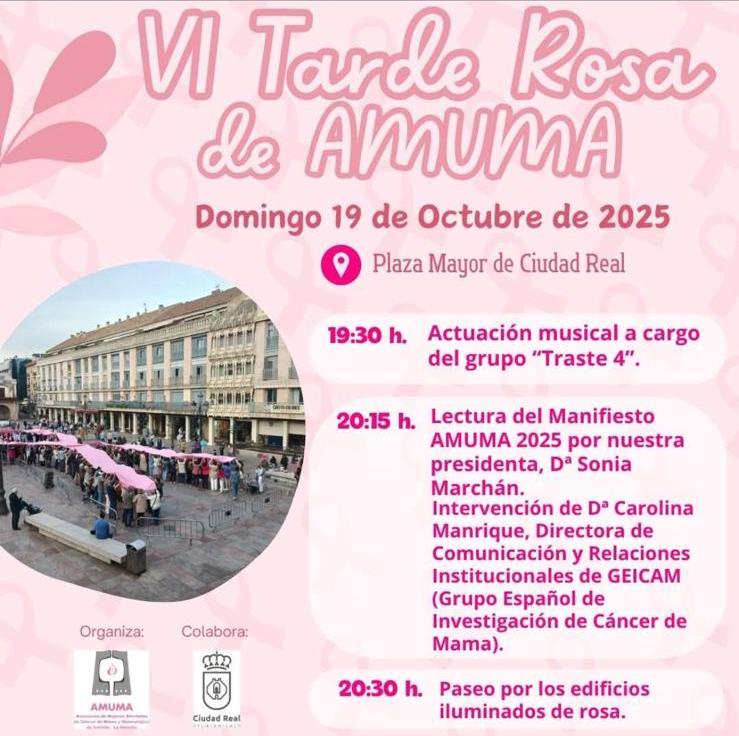 VI Tarde Rosa de AMUMA Domingo 19 de Octubre de 2025, en la Plaza Mayor de Ciudad Real. 19:30 Actuación musical a cargo del grupo "Traste 4" 20:15 Lectura del Manifiestos AMUMA 2025 20:30 Paseo por los edificios iluminados de rosa. Muchas gracias a todas las...