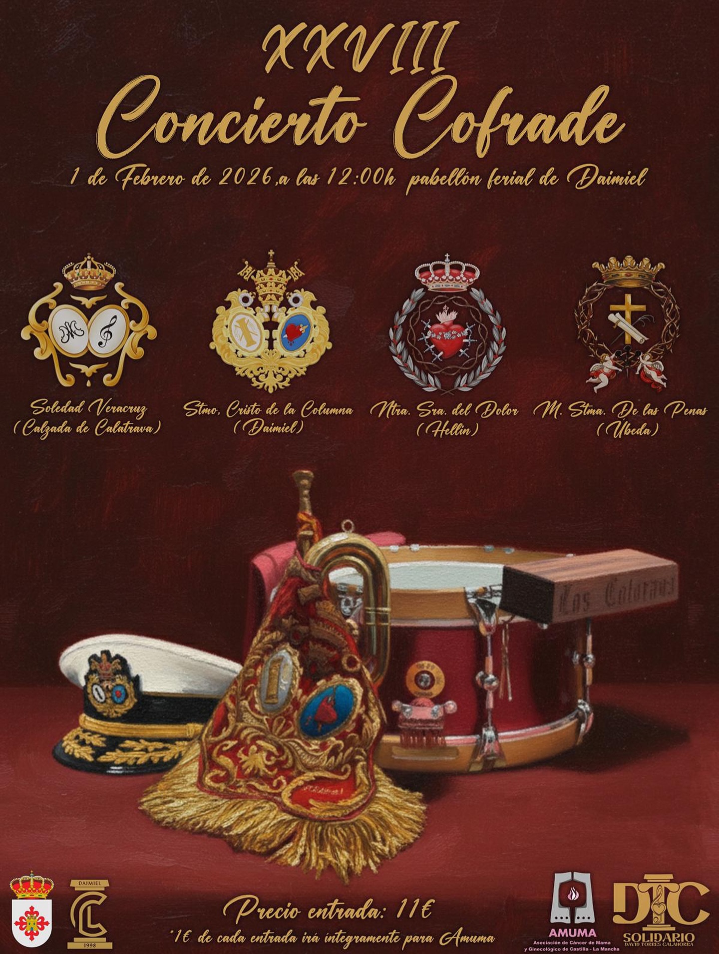 XXVIII CONCIERTO CUARESMA El próximo 1 de febrero tendrá lugar en Daimiel la 28º edición de nuestro concierto cofrade. Este año contaremos con las siguientes formaciones: - Banda CCTT María Stma de las Penas - Banda Ntra. Sra. del Dolor Hellín. Soledad de Calzada...