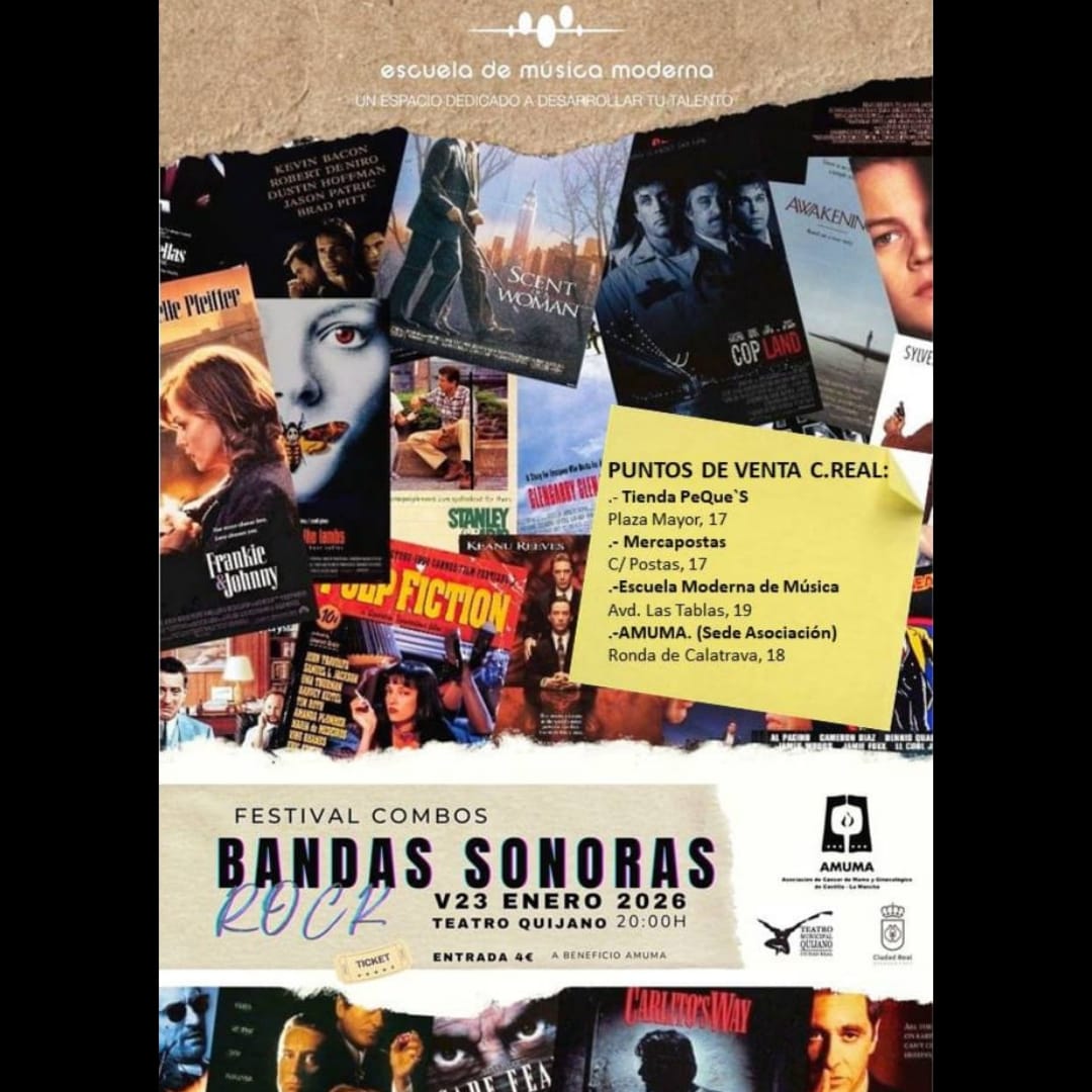 CONCIERTO BANDAS SONORAS Comenzamos el año de la mejor manera posible, con música y ritmo. Con un concierto solidario, de Bandas Sonoras de Rock, organizado por la Escuela de Música Moderna a beneficio de AMUMA. Viernes, 23 de enero de 2026 a las 20:00 en el Teatro...